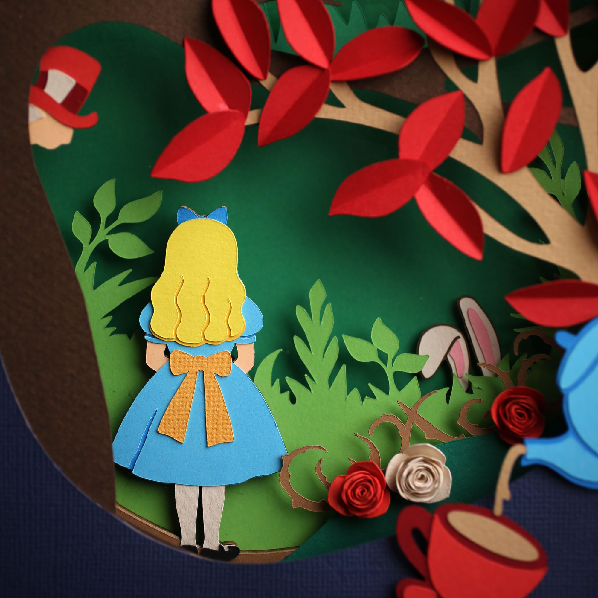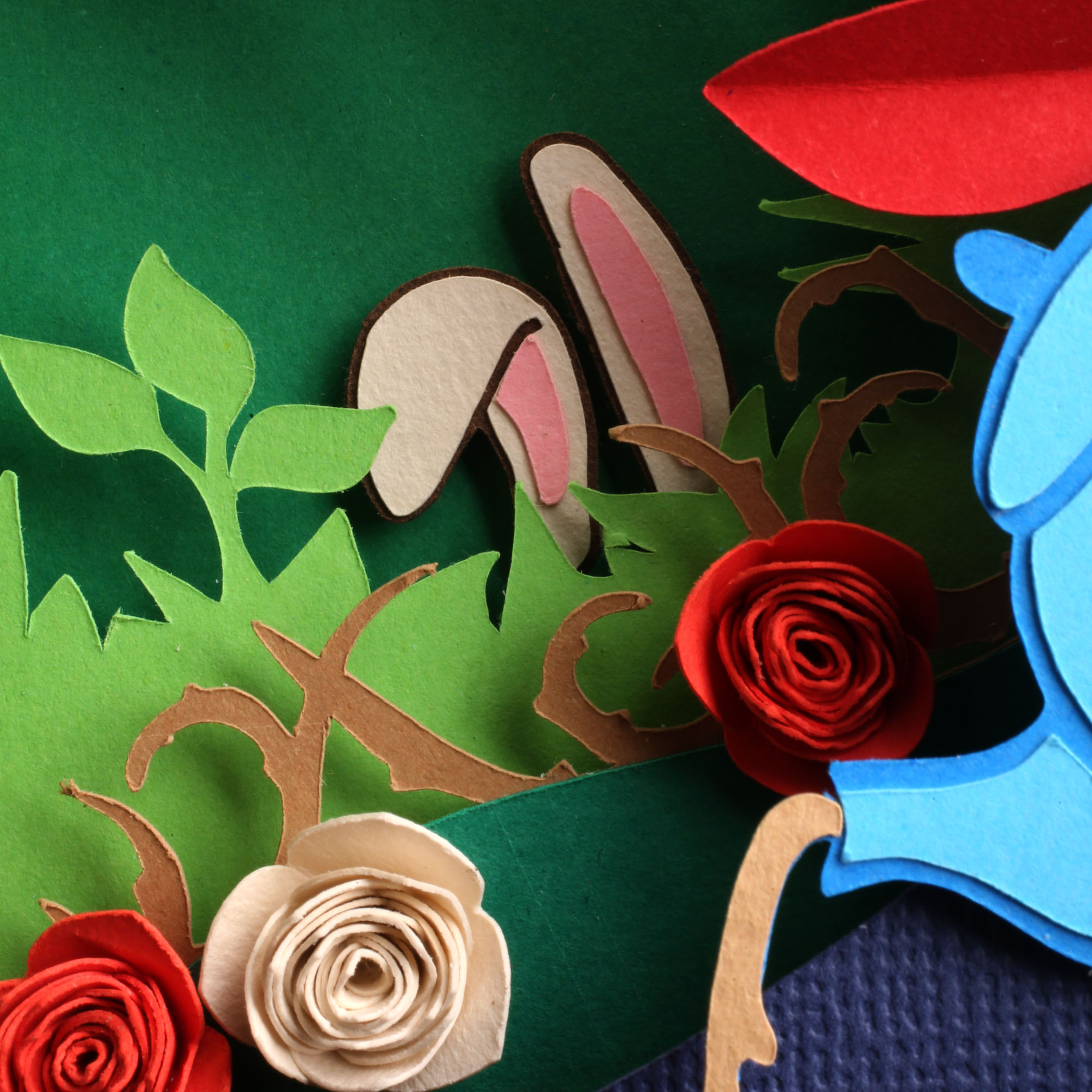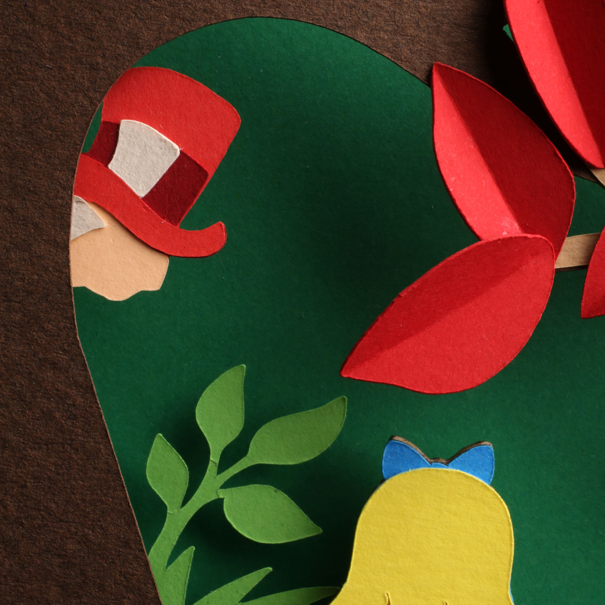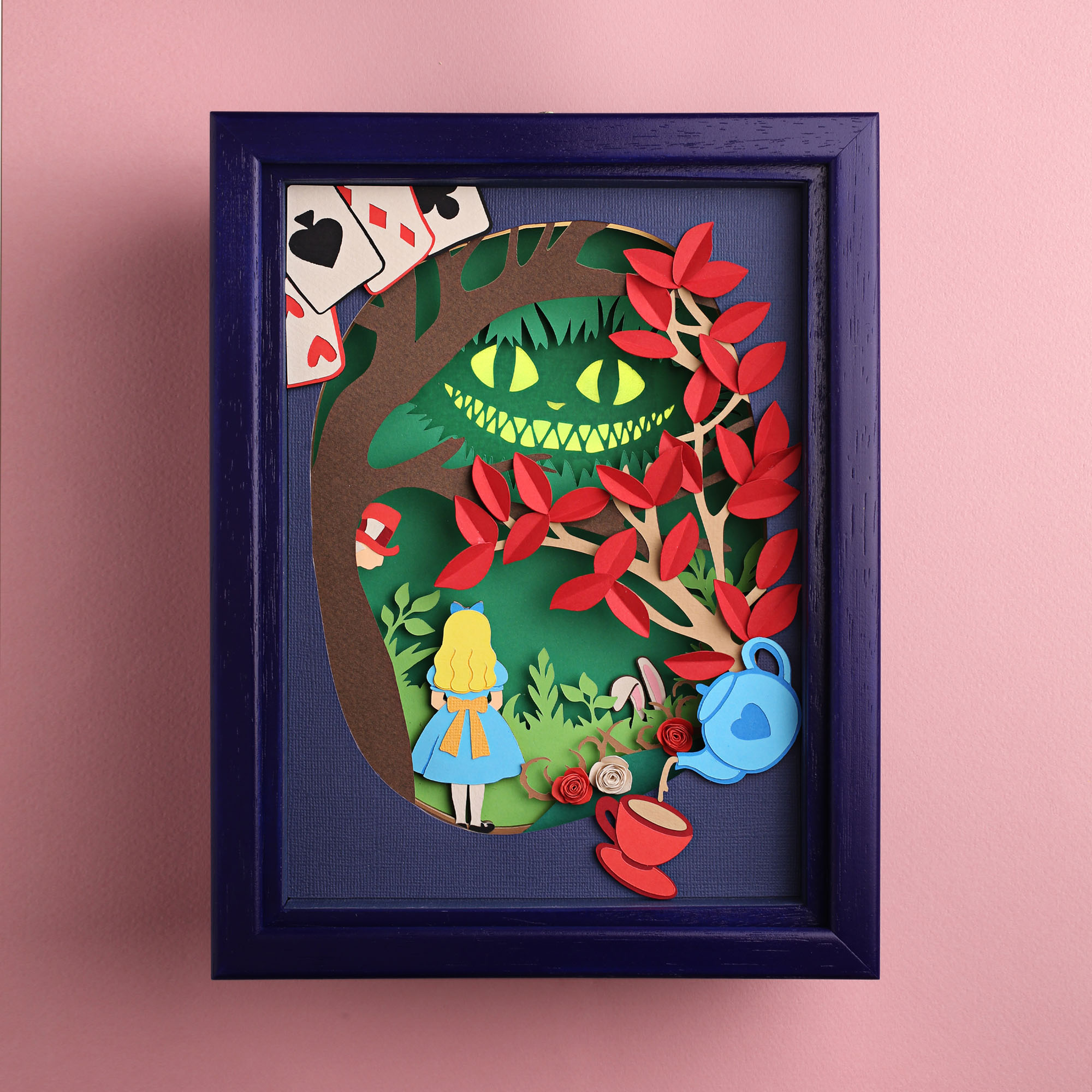 Una escena en relieve inspirada en la famosa escena del Gato Cheshire y su misteriosa sonrisa, la magia y la imaginación aparecen través de capas de cartulina de bellas artes y luz suave. COn la luza apagada, Alicia se encuentra a punto de adentrarse en el bosque. Con la luz encendida la sonrisa del Gato Cheshire aparacerá sobre los árboles.