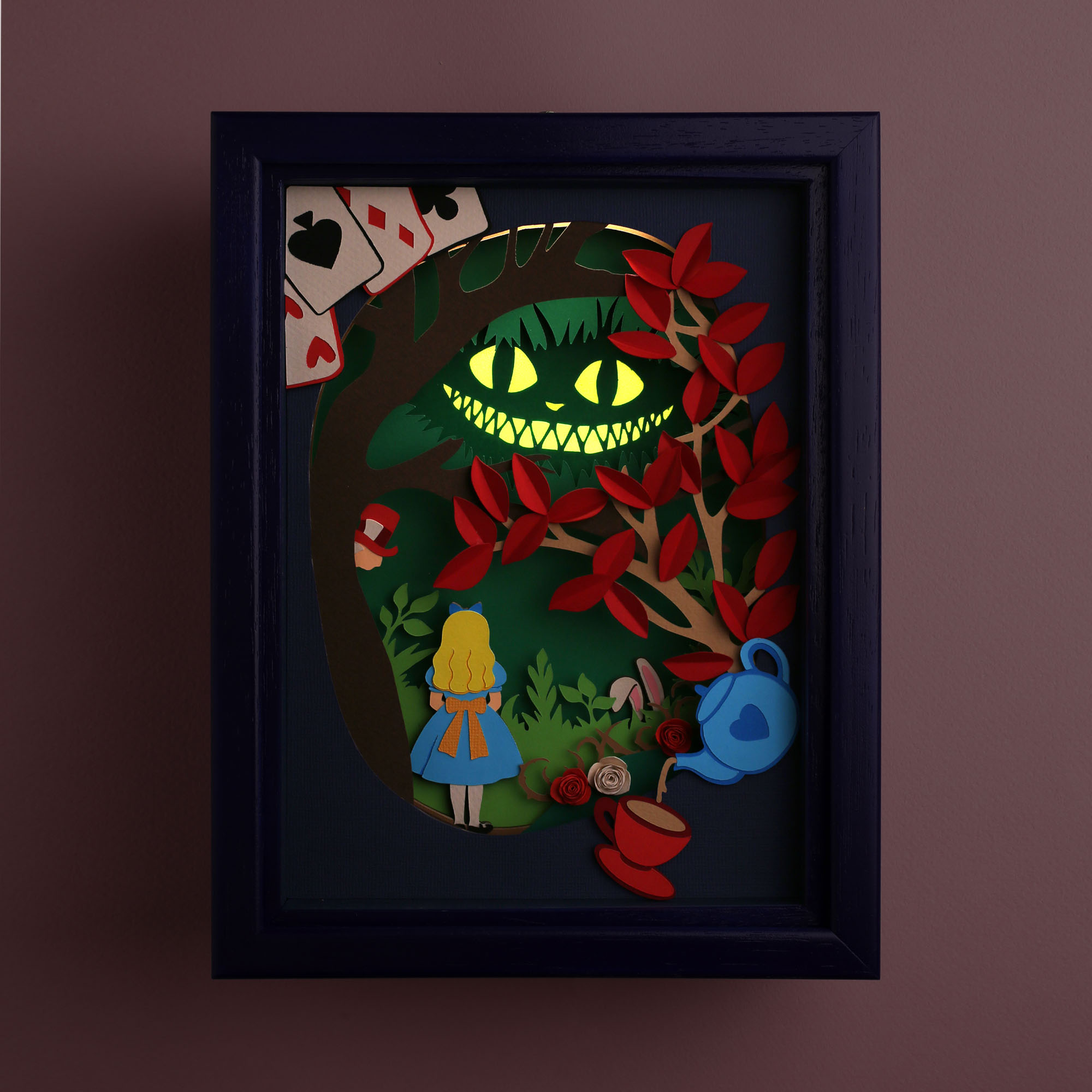 Cuadro iluminado artesanal inspirado en Alicia en el País de las Maravillas.