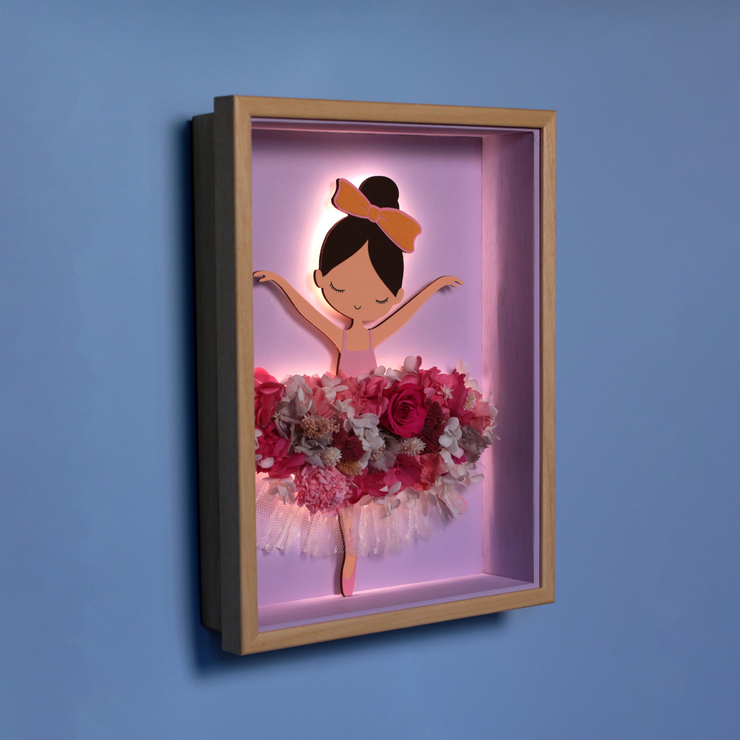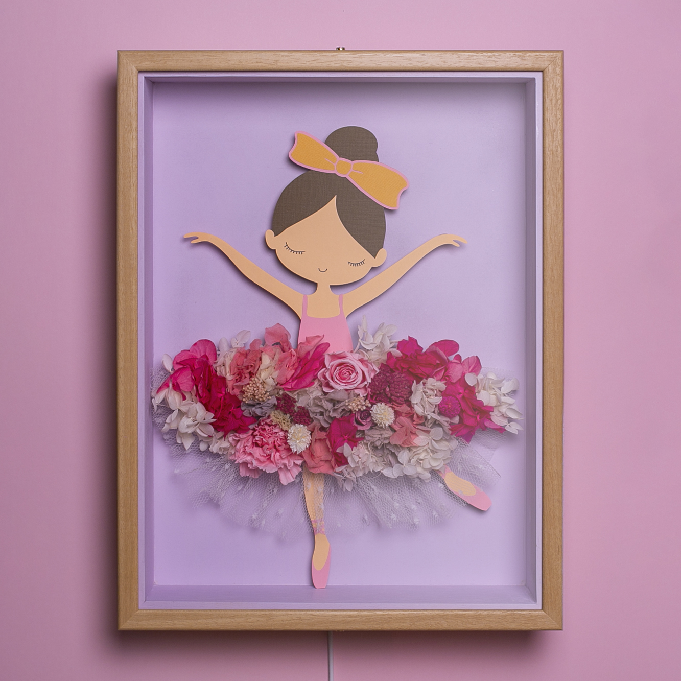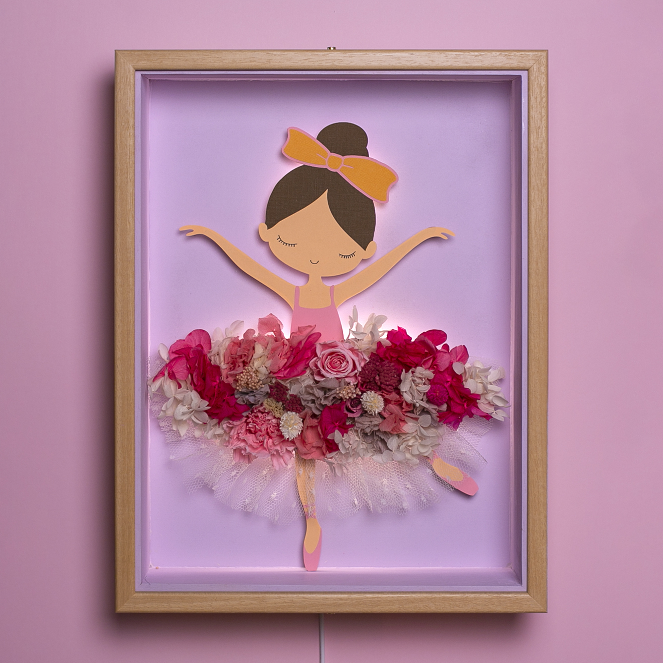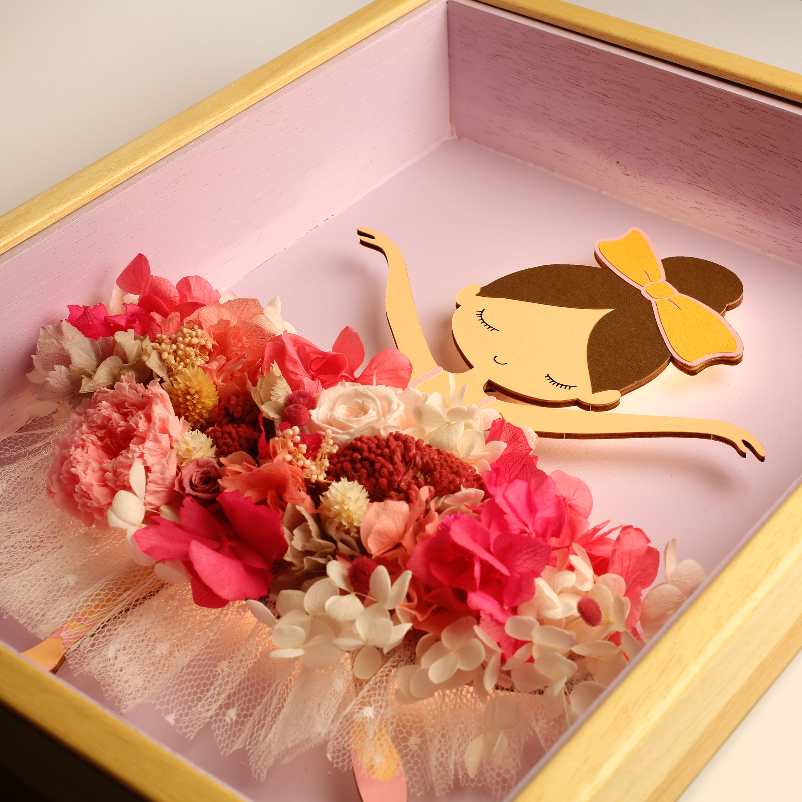 La falda de la bailarina presenta una composición elaborada con flores preservadas, garantizando su durabilidad durante años sin necesidad de mantenimiento.