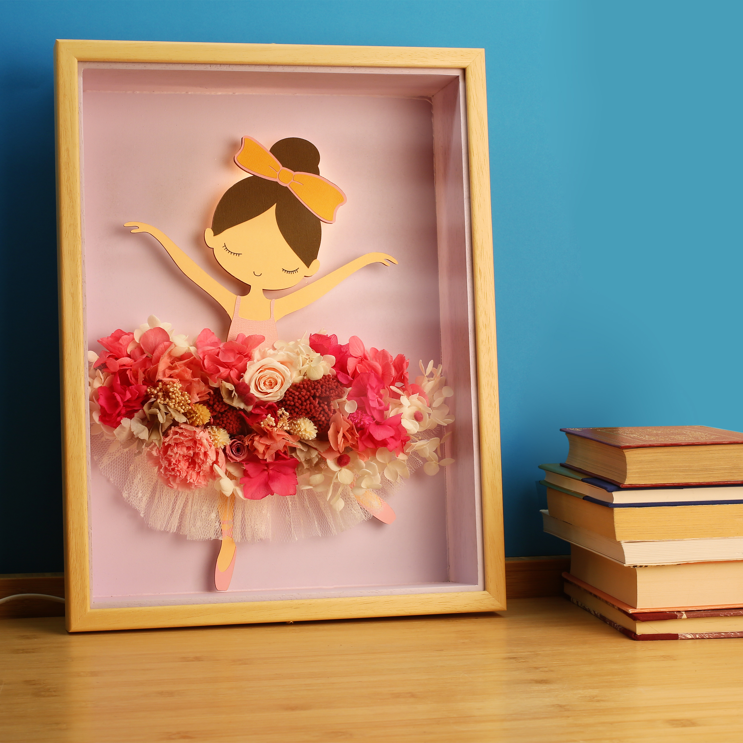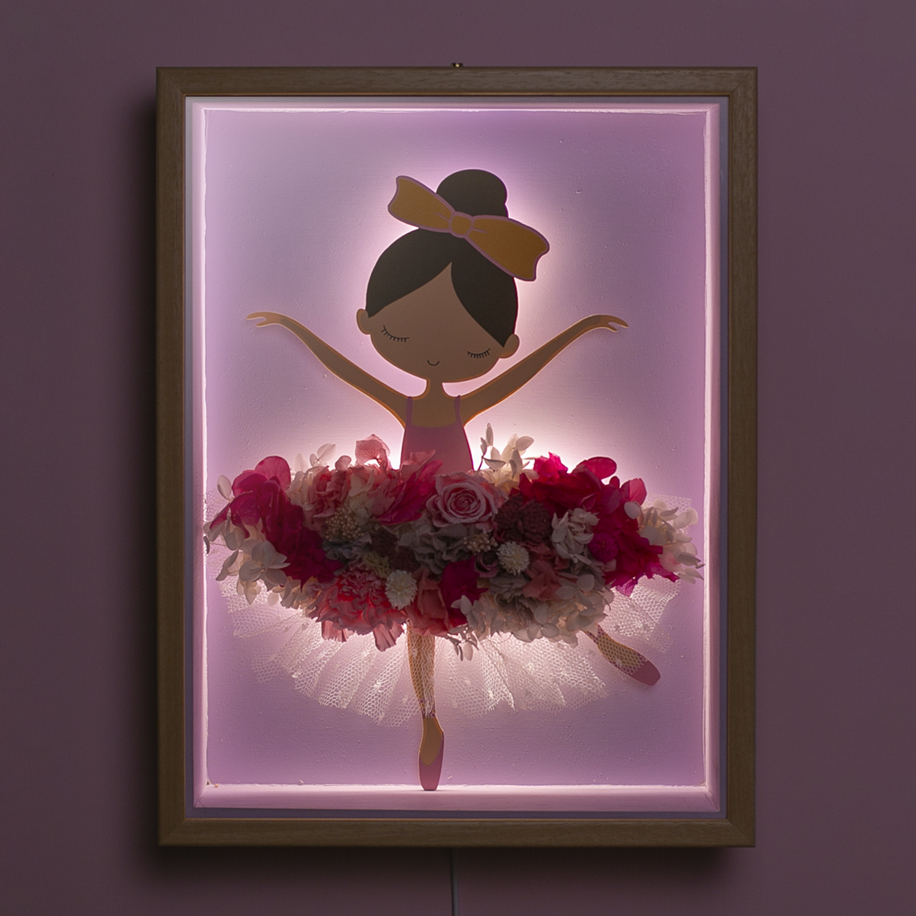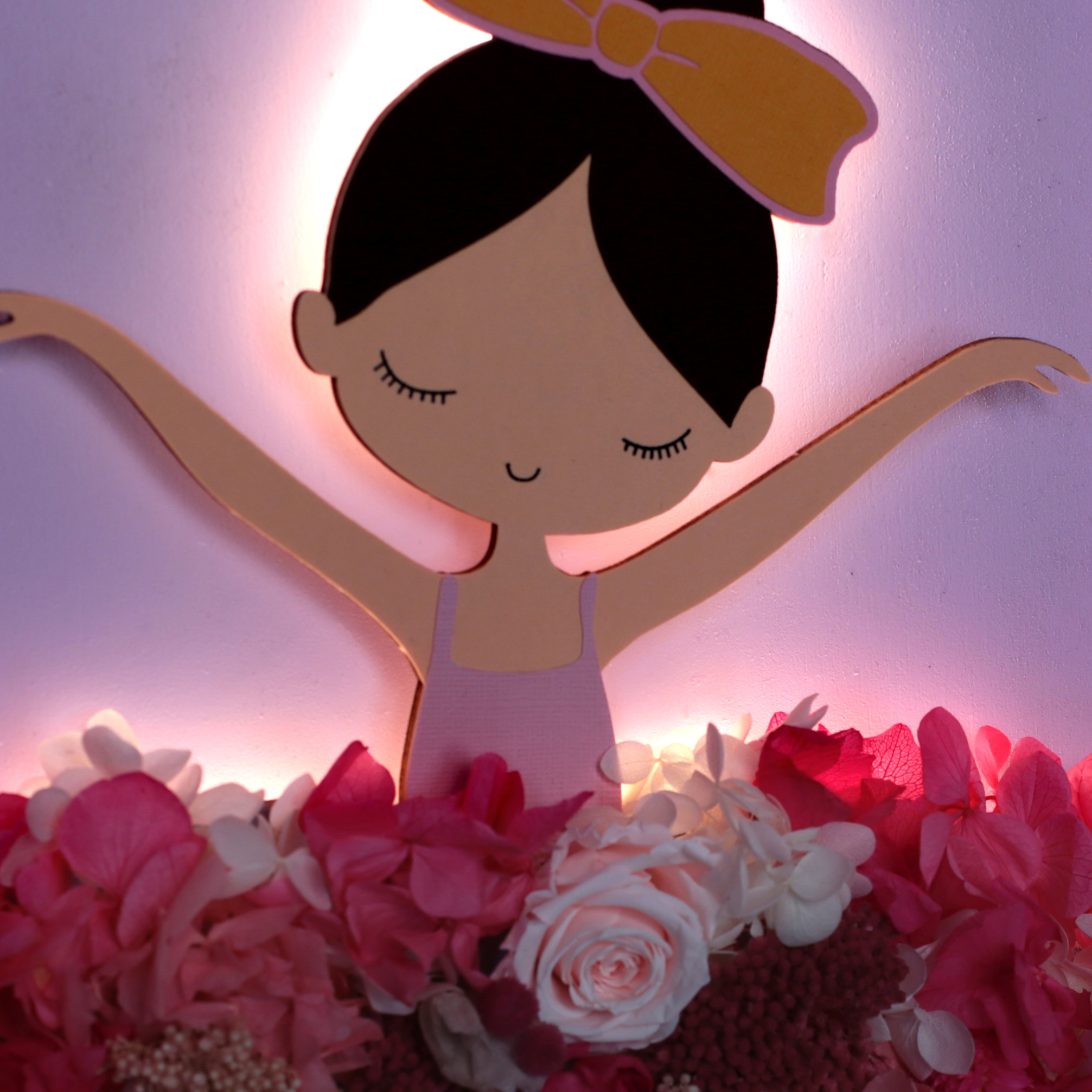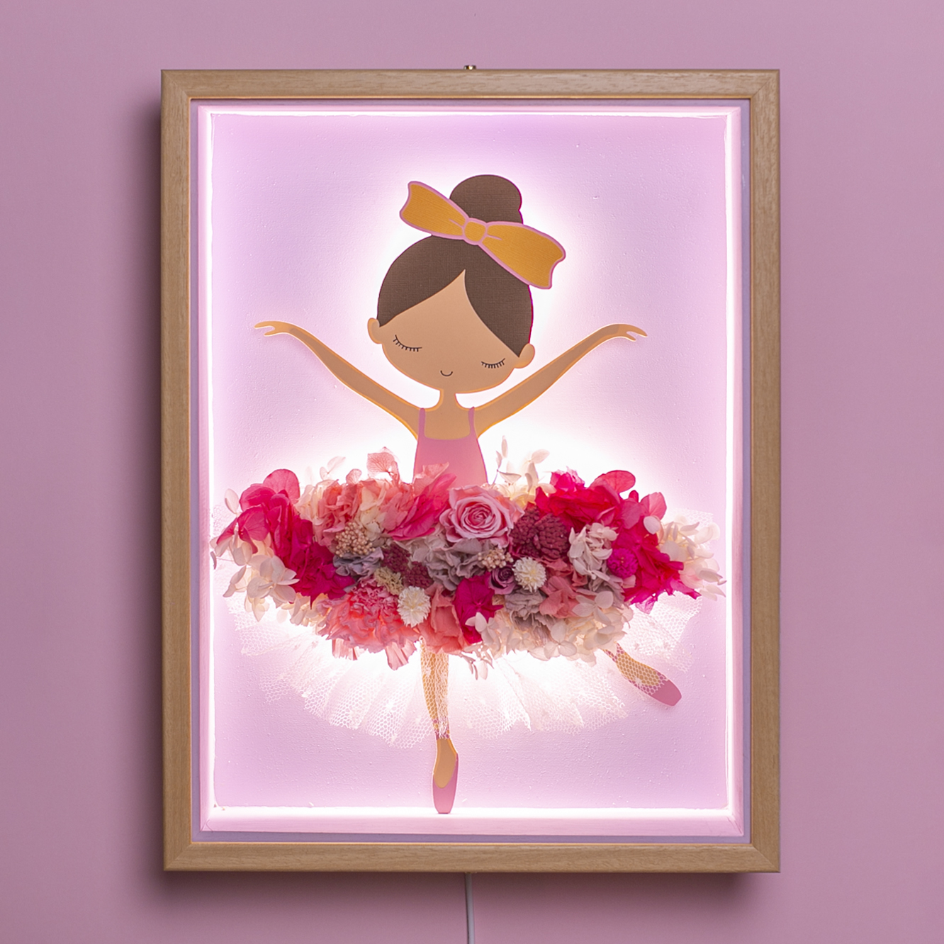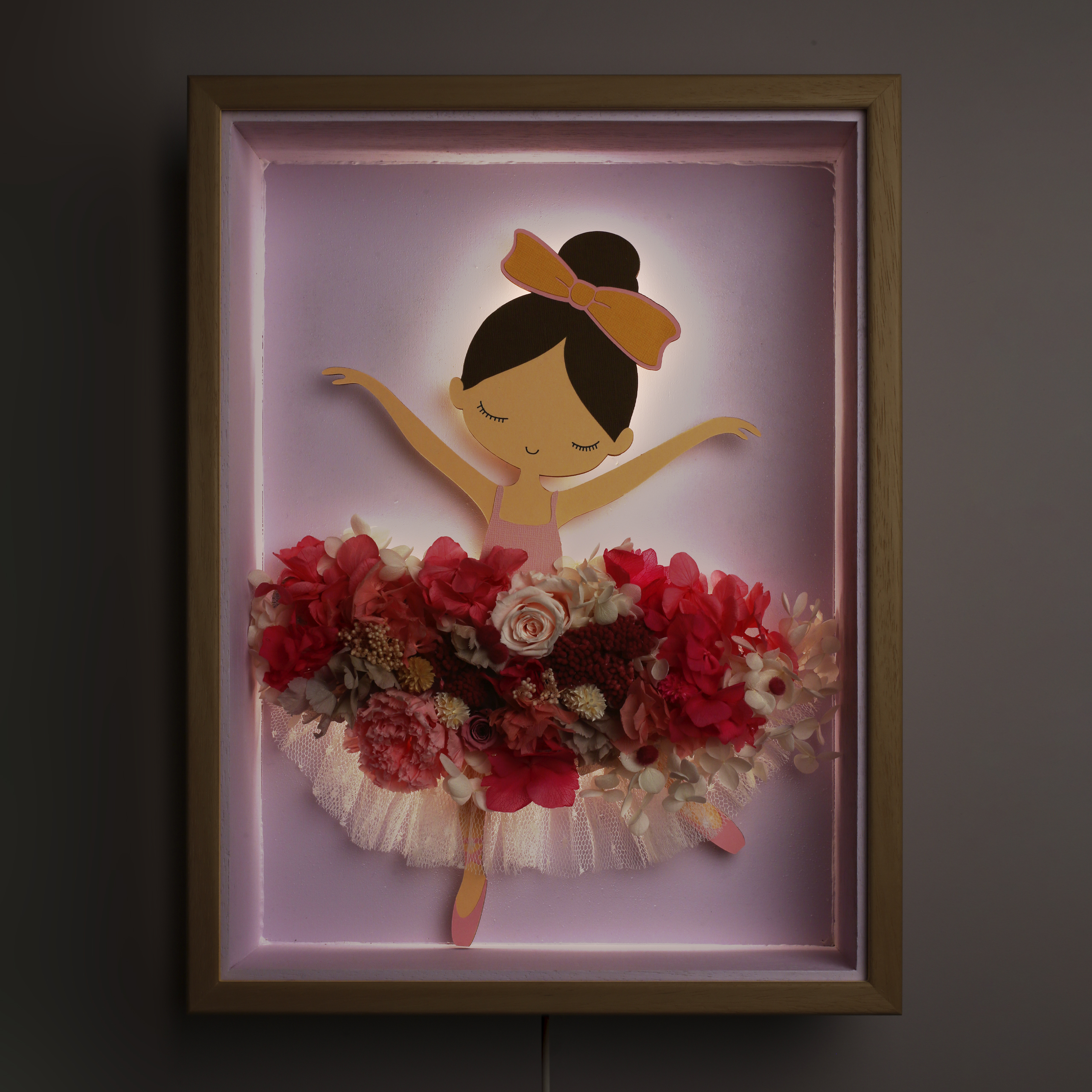 La falda de la bailarina presenta una composición elaborada con flores preservadas, garantizando su durabilidad durante años sin necesidad de mantenimiento.