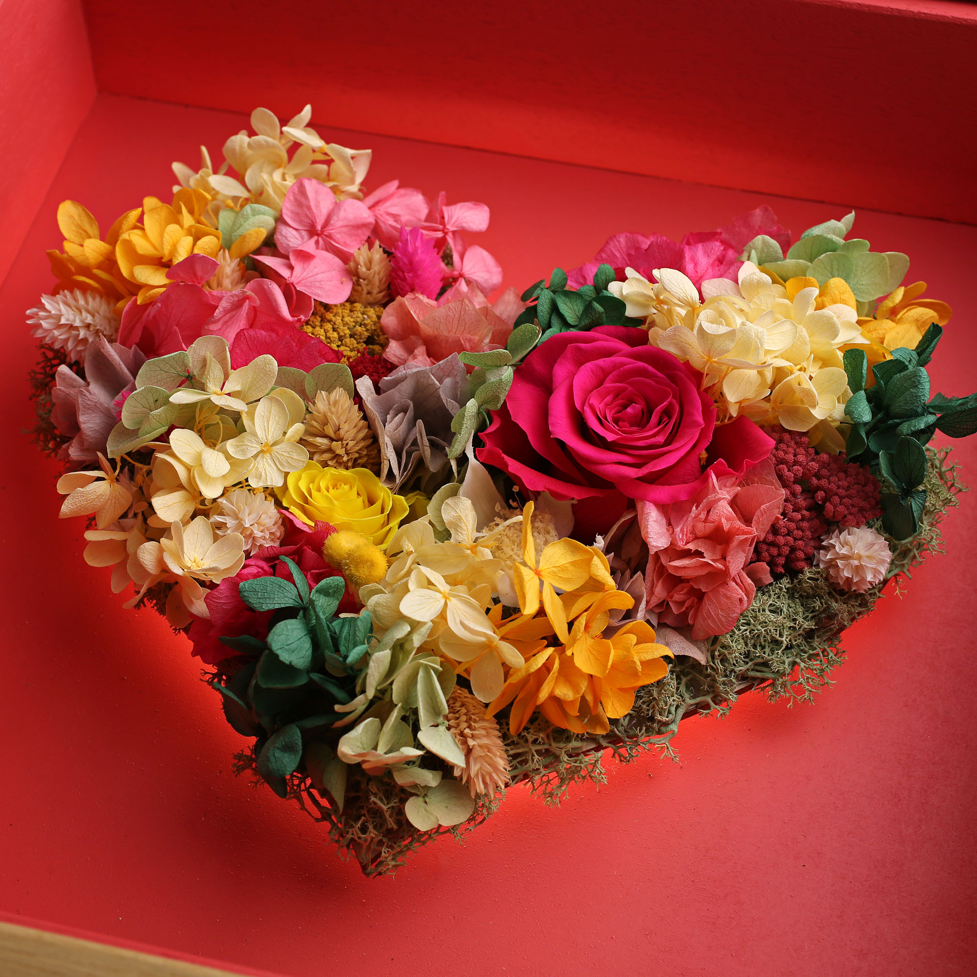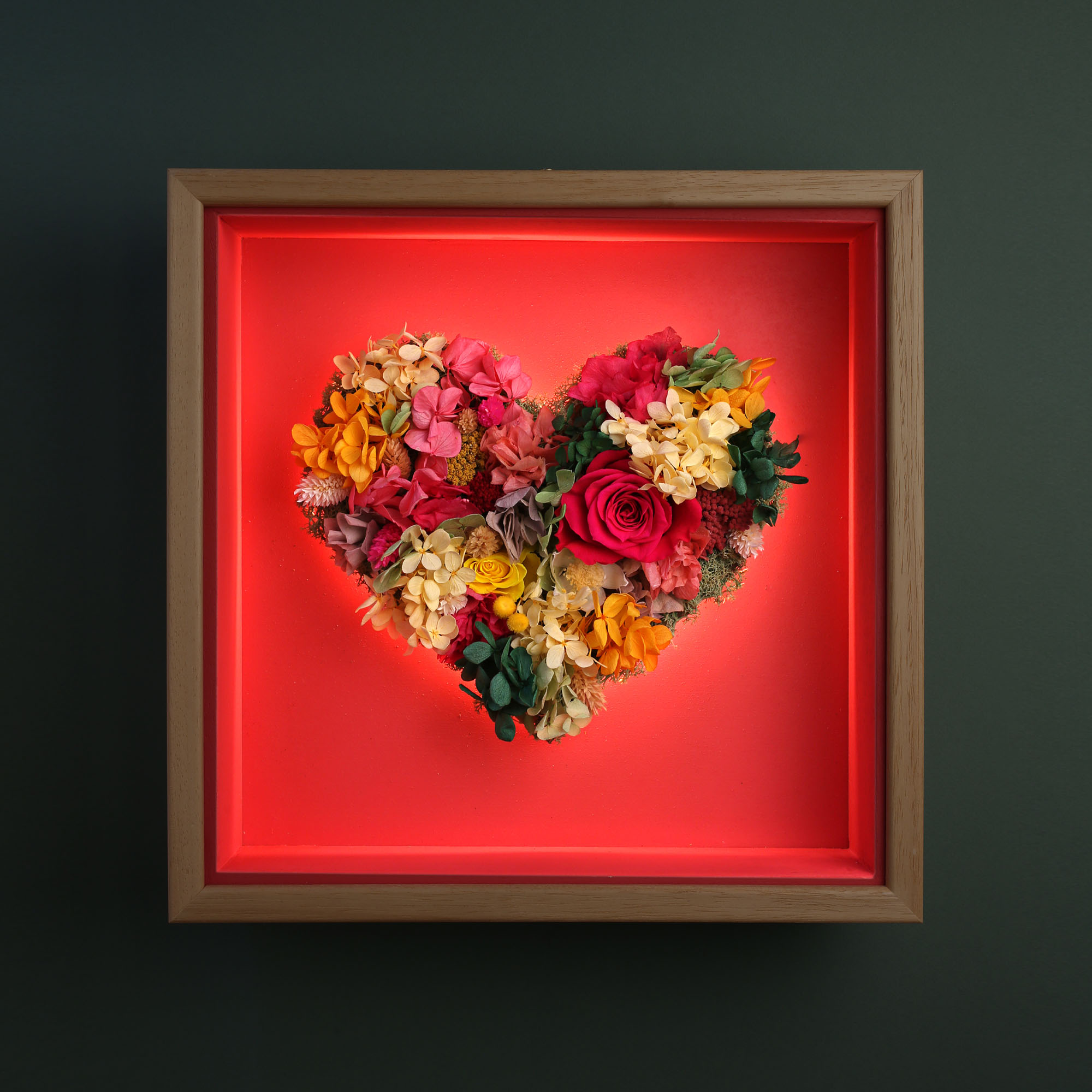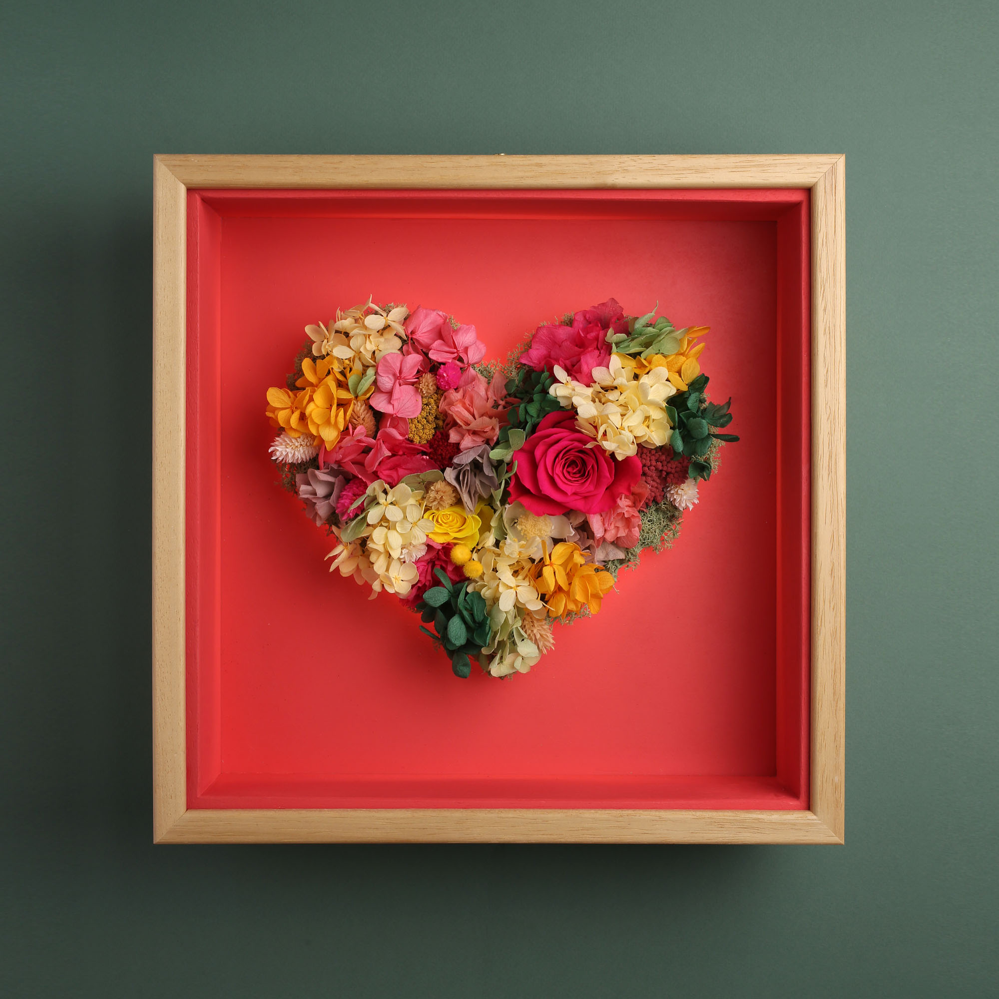 El Corazón Frida, toda la fuerza de la naturaleza en una vibrante composición de tonos rojos, amarillos y verdes.Flores preservadas de alta calidad presentadas en marco de madera de samba, con fondo en rojo intenso. Acabado exterior en barniz satinado de tacto sedoso. Protegido con un cristal frontal que garantiza durabilidad..