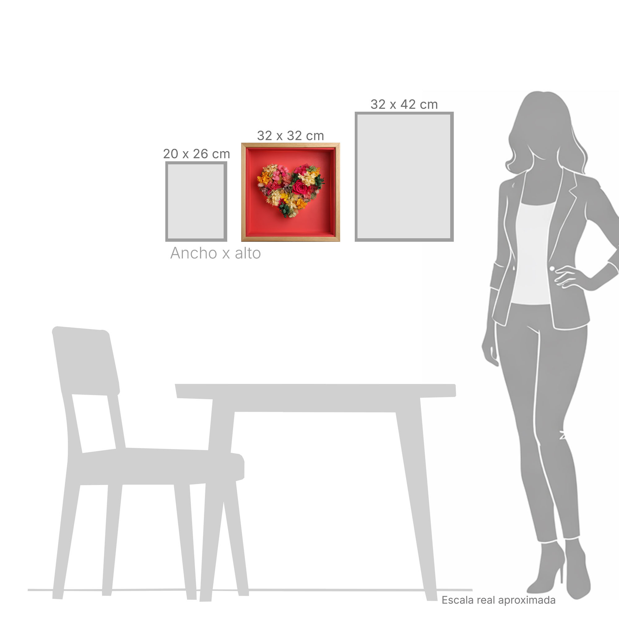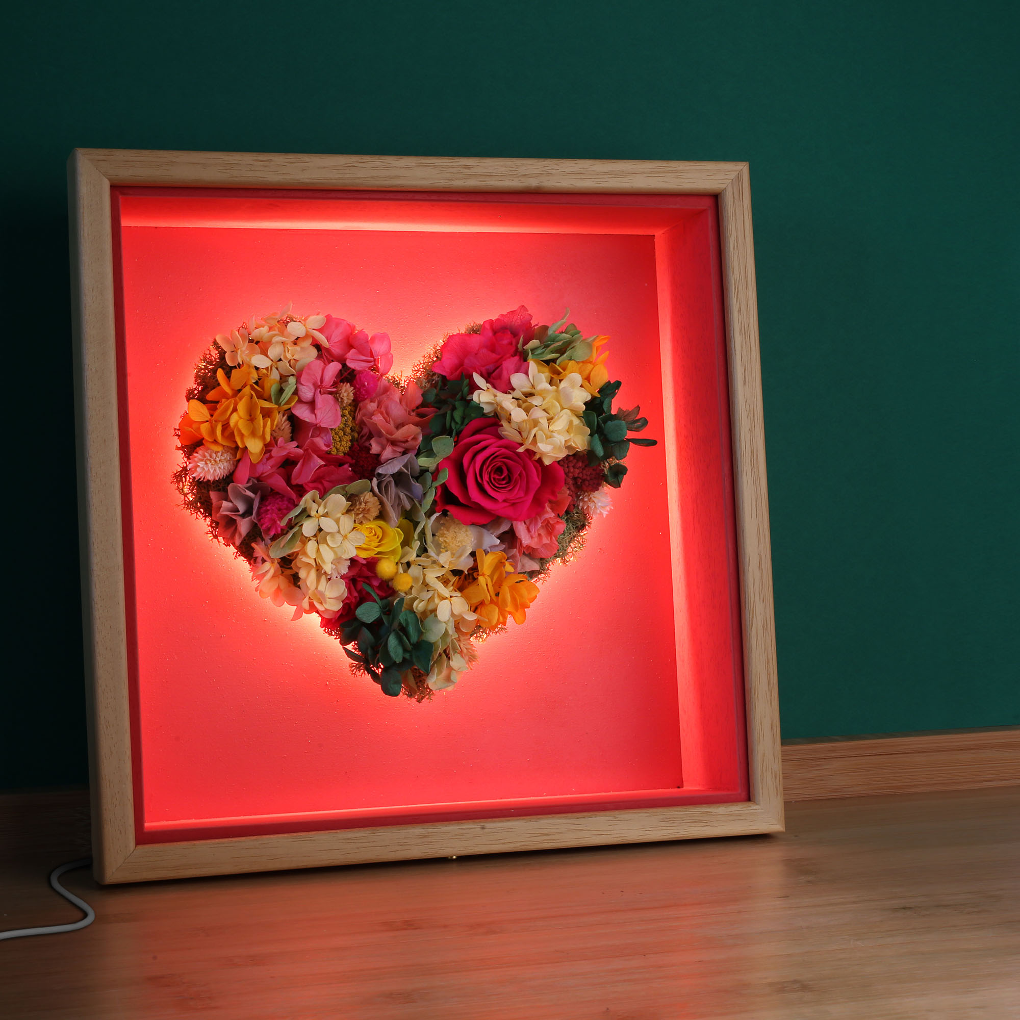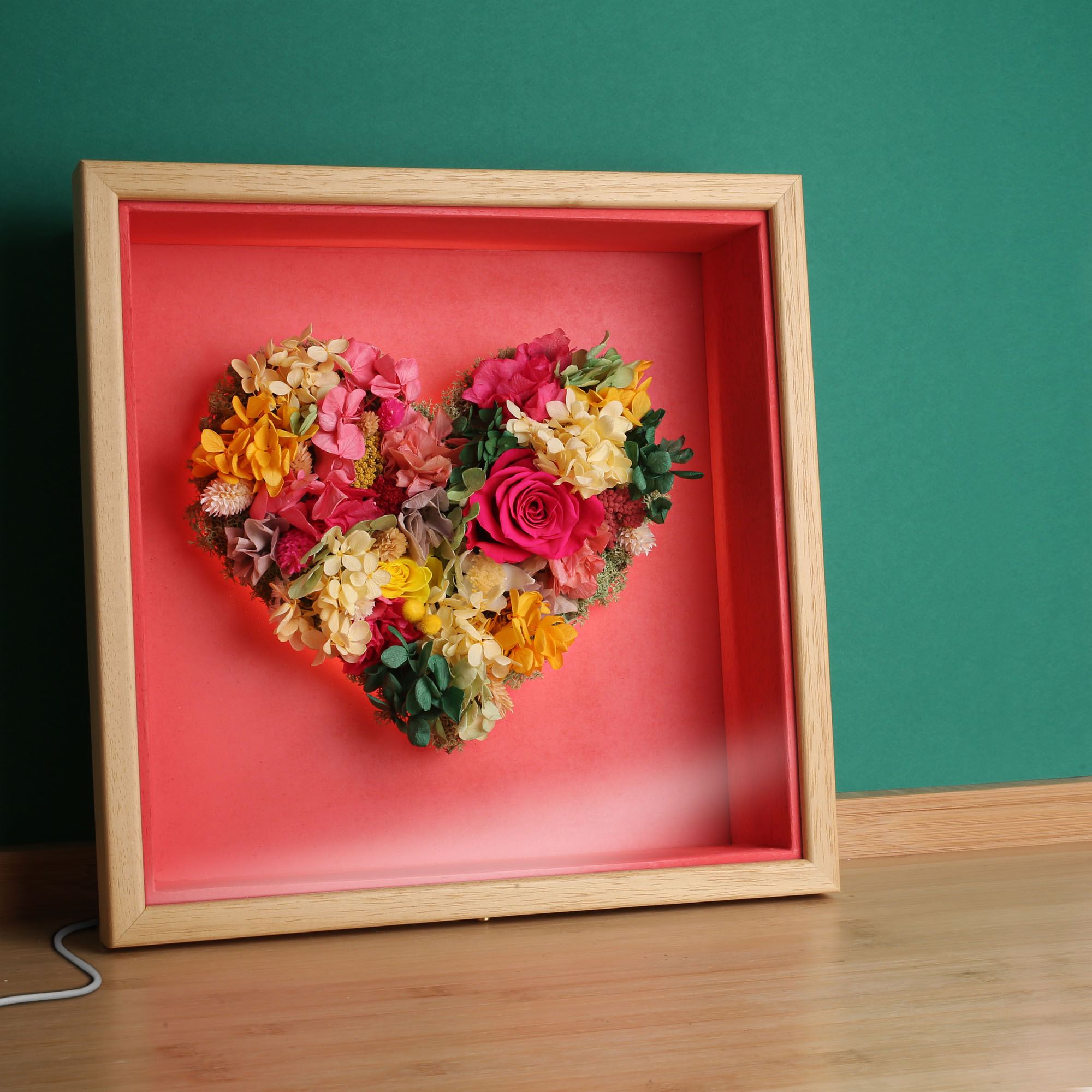 El Corazón Frida, toda la fuerza de la naturaleza en una vibrante composición de tonos rojos, amarillos y verdes.Flores preservadas de alta calidad presentadas en marco de madera de samba, con fondo en rojo intenso. Acabado exterior en barniz satinado de tacto sedoso. Protegido con un cristal frontal que garantiza durabilidad..