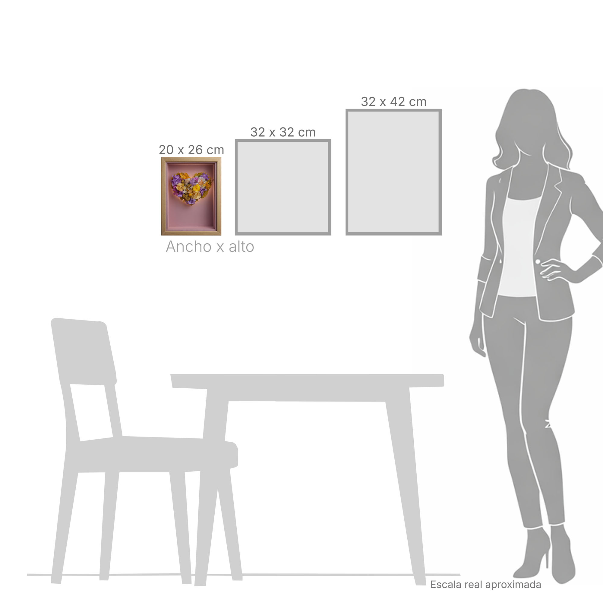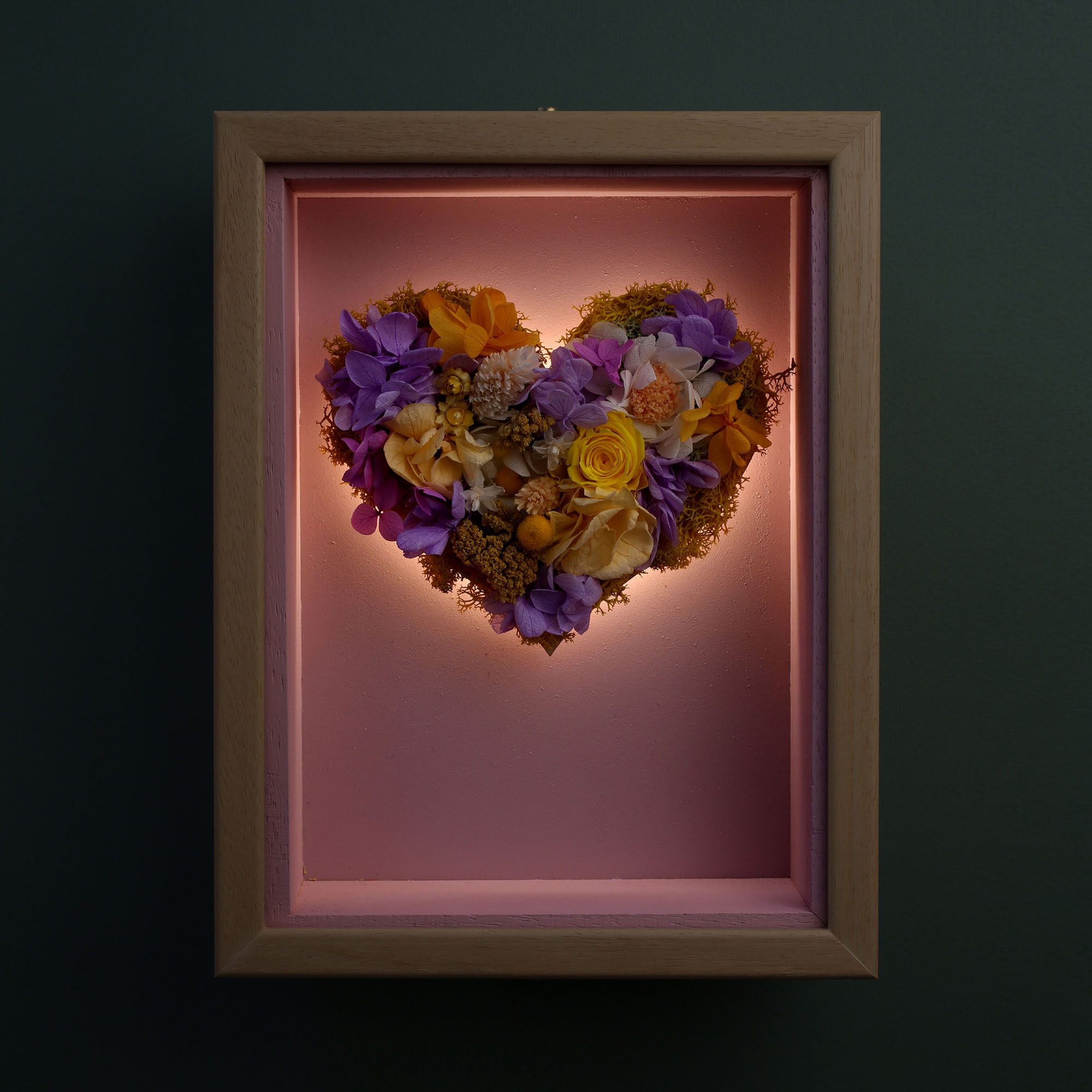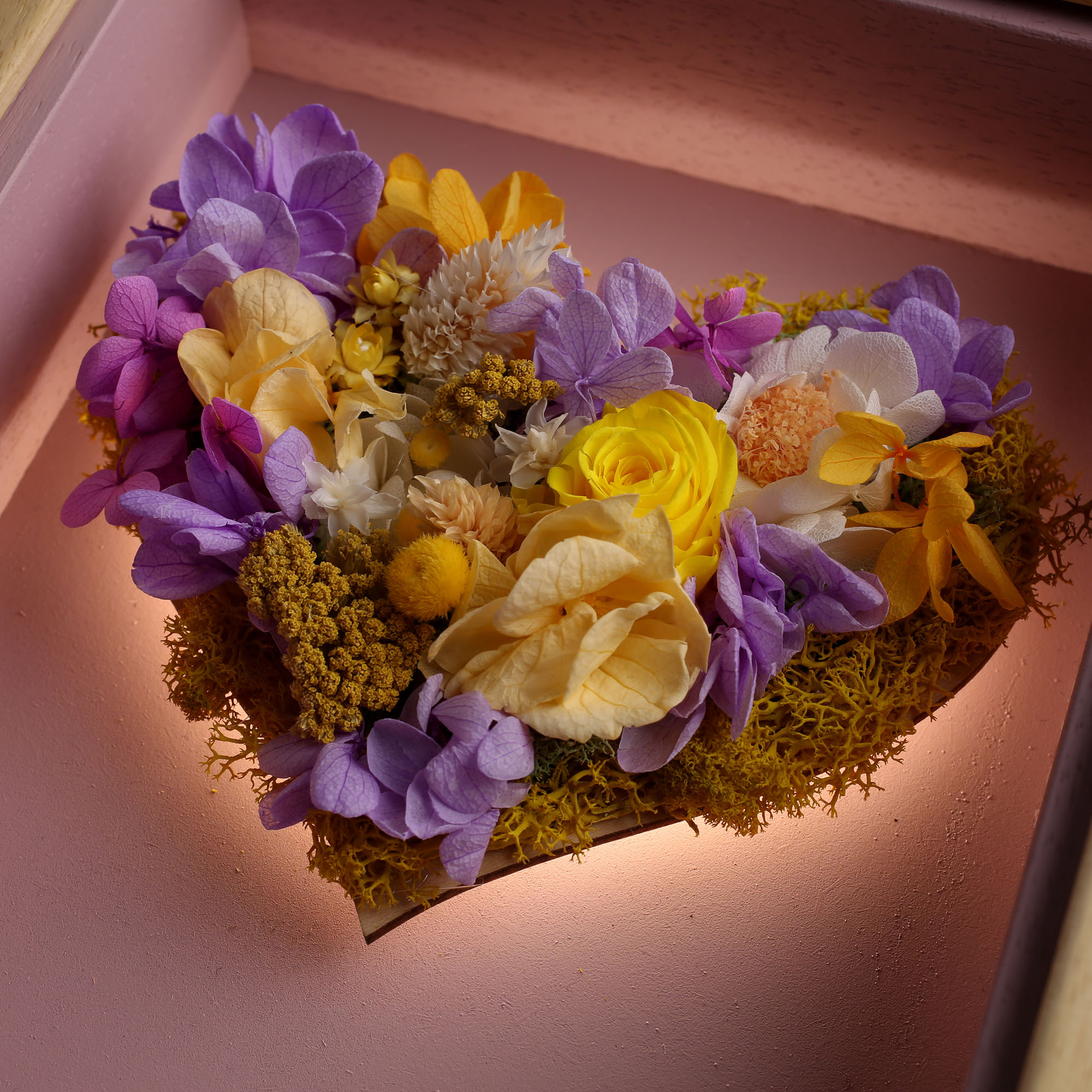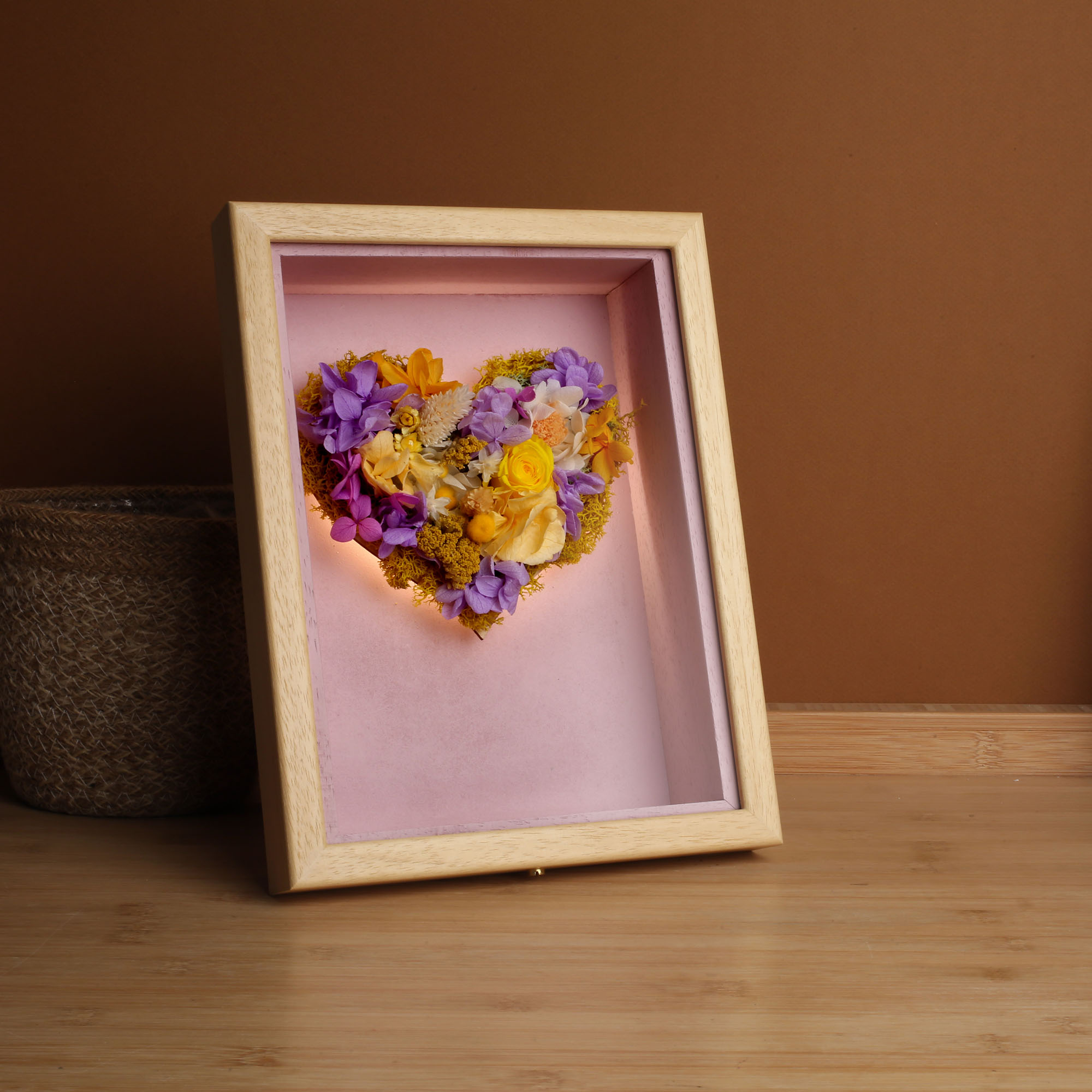 El Corazón Aurora presenta una composición floral equilibrada en tonos malva, amarillo suave y crema, dispuesta sobre un fondo rosa empolvado. Las flores preservadas de alta calidad se integran en un marco de madera de samba, con acabado exterior en barniz satinado de tacto sedoso. El conjunto se protege con un cristal frontal que garantiza durabilidad y un acabado elegante.