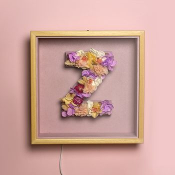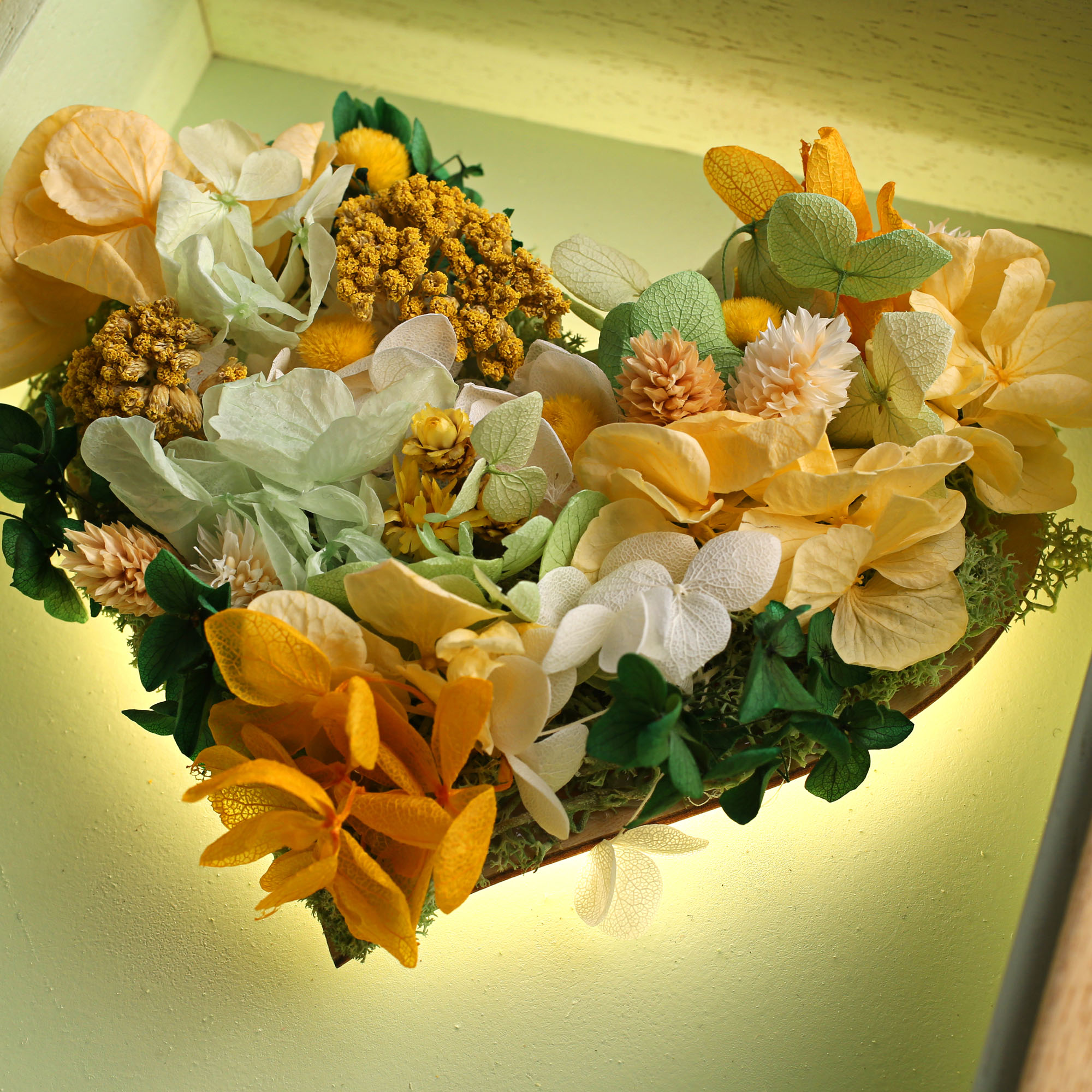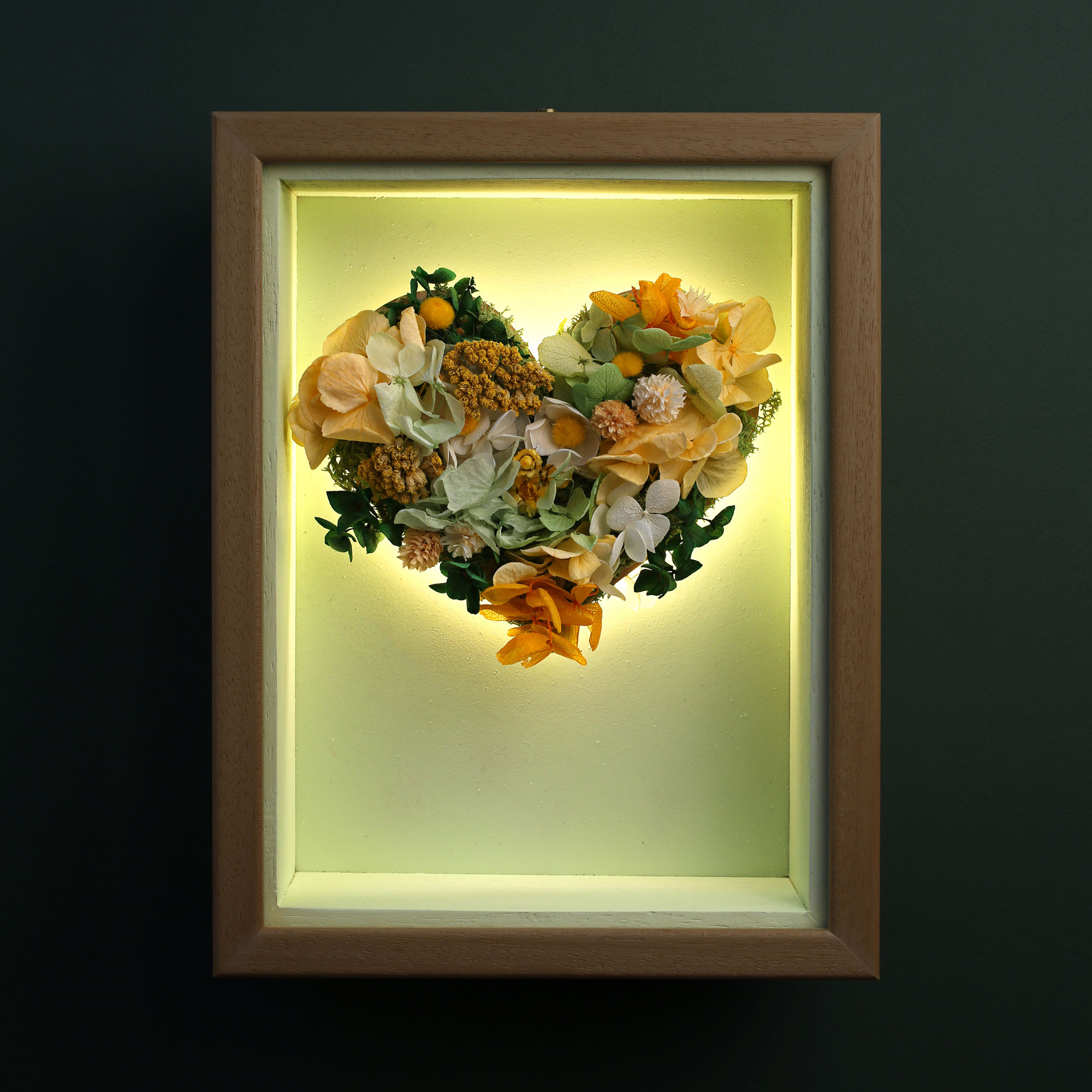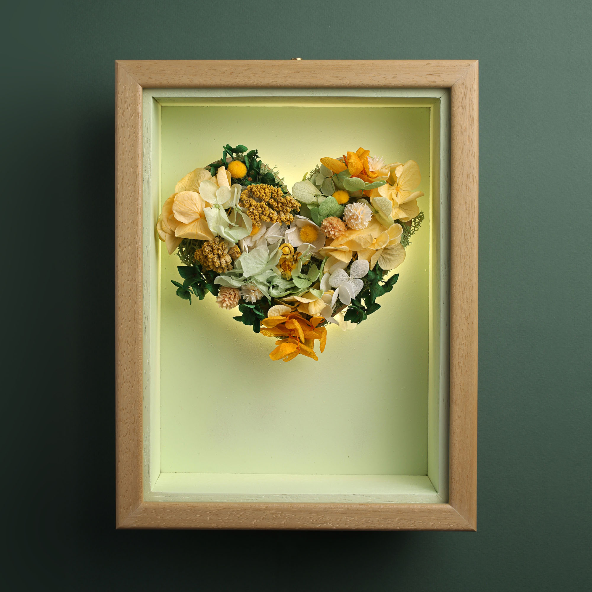 Corazón de flores preservadas, tamaño pequeño. Composición floral luminosa en tonos amarillo suave, crema y malva sobre fondo empolvado, pensada para crear pequeños gestos de calidez y vitalidad. Una pieza delicada y duradera para acompañar rincones especiales.