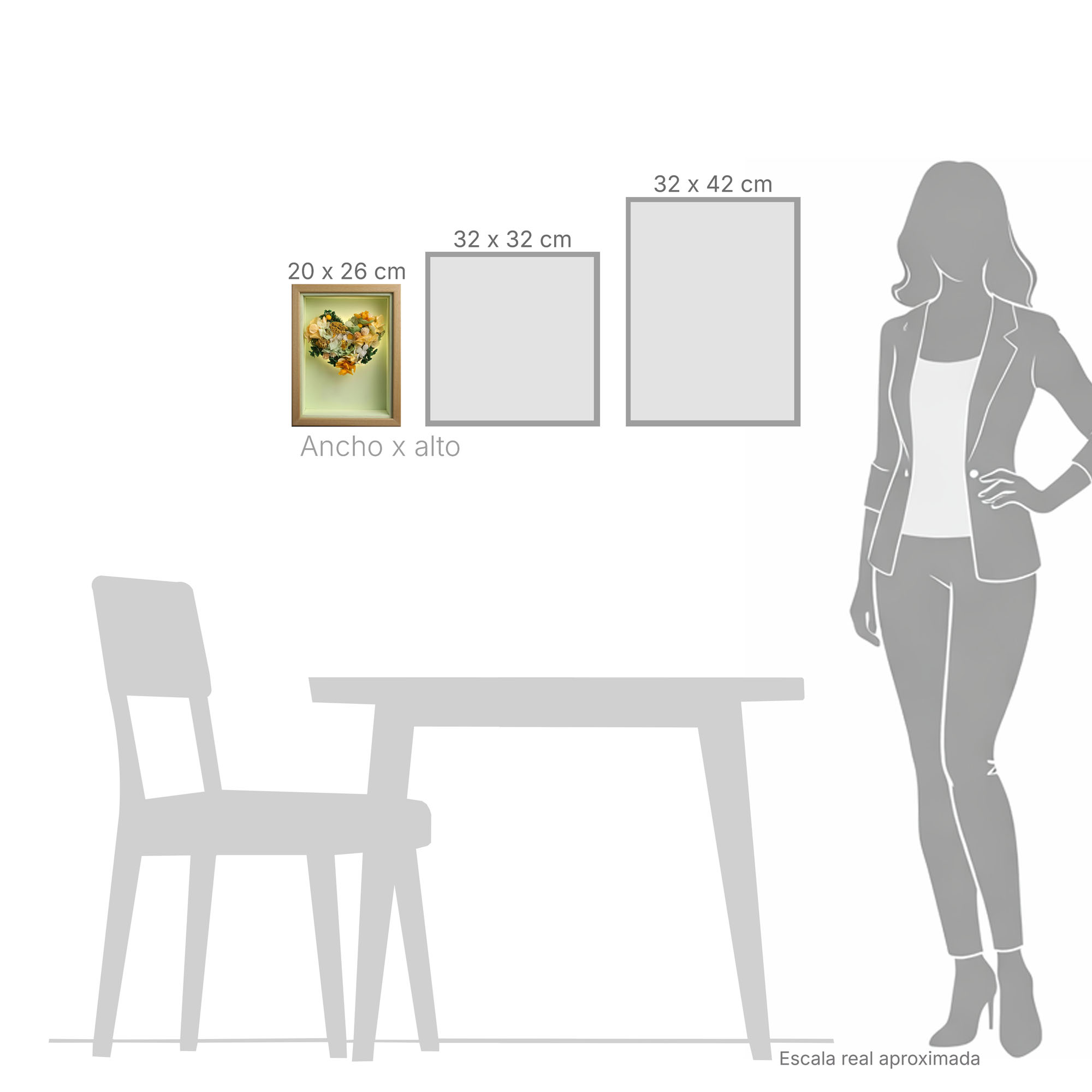 El Corazón Saviapresenta una composición luminosa y equilibrada que evoca la energía serena de la naturaleza. Sus tonos suaves y cálidos aportan vitalidad sin estridencias, convirtiéndola en una pieza ideal para crear pequeños ambientes acogedores y llenos de vida. Las flores se integran en un marco de madera de samba sobre delicado fondo verde. Acabado exterior en barniz satinado de tacto sedoso. El conjunto se protege con un cristal frontal que garantiza durabilidad y un acabado elegante.