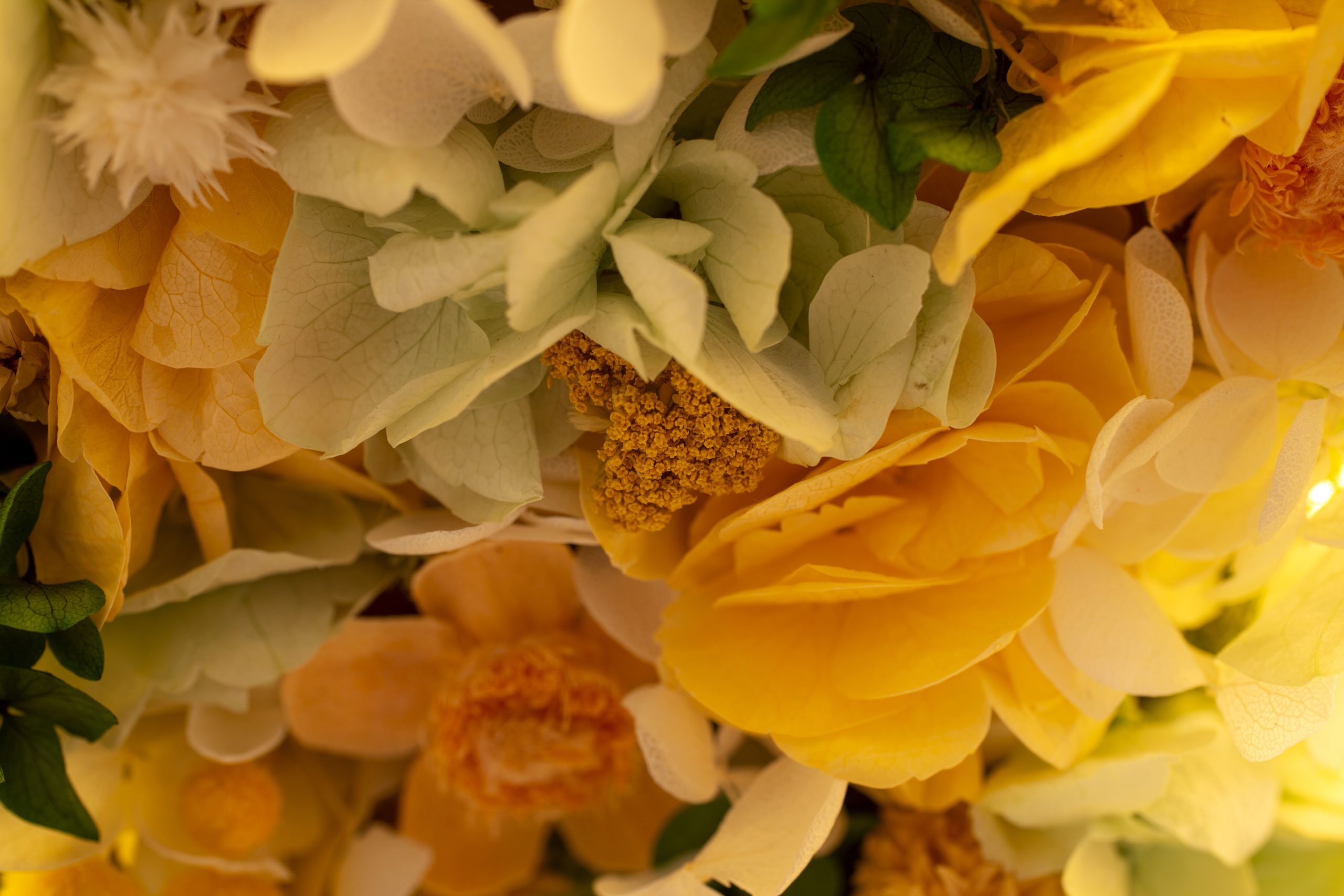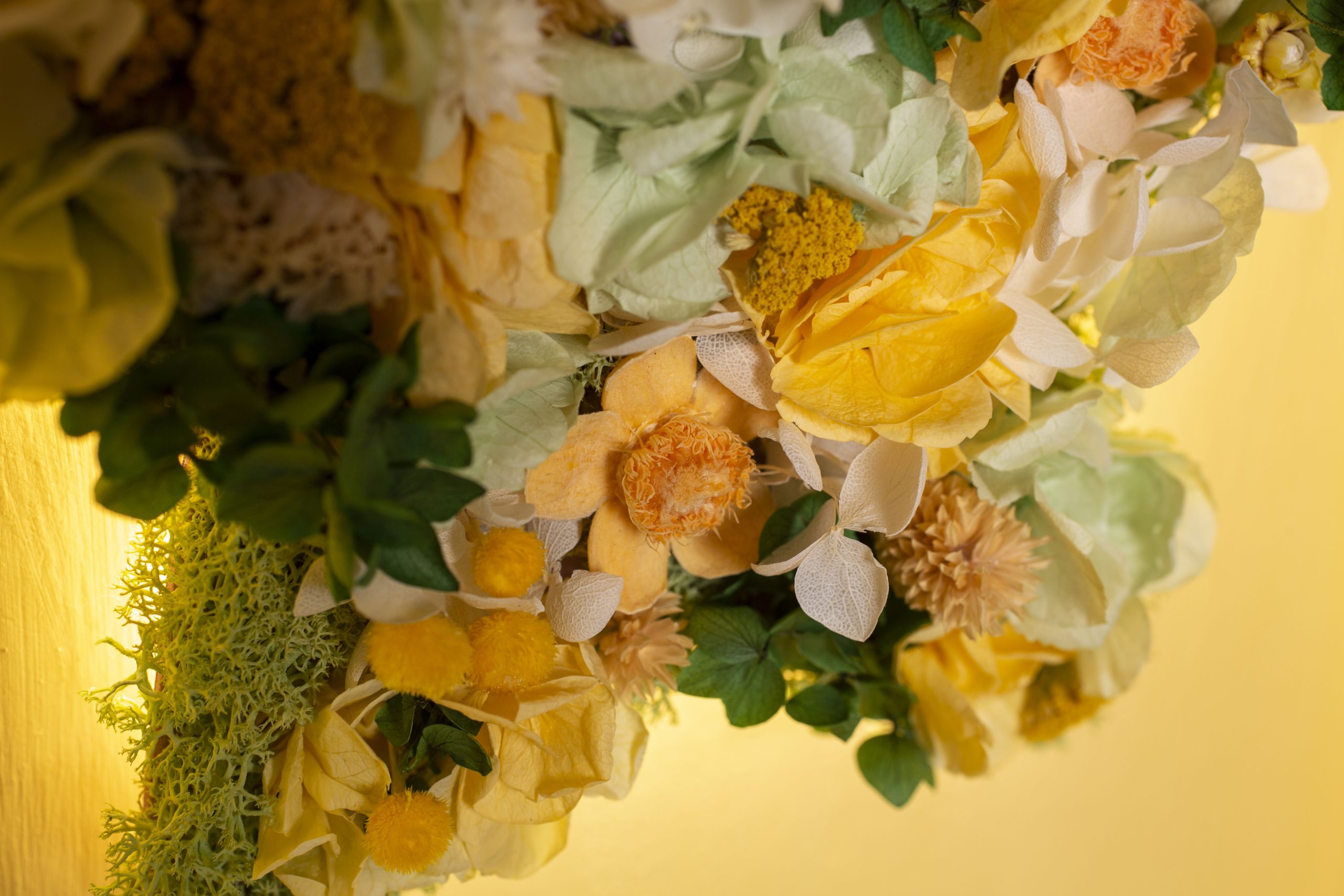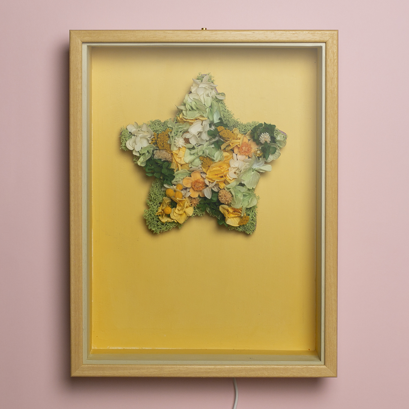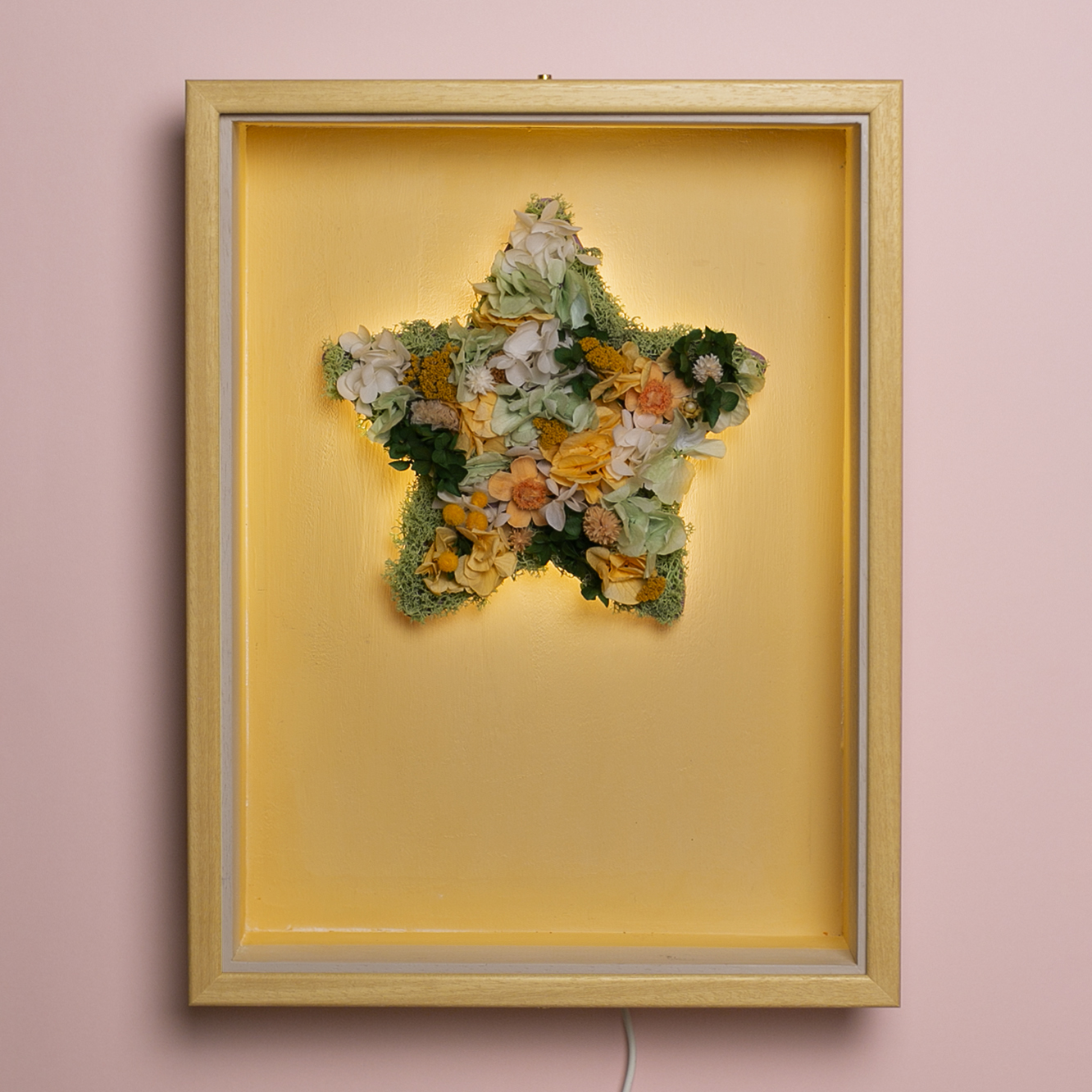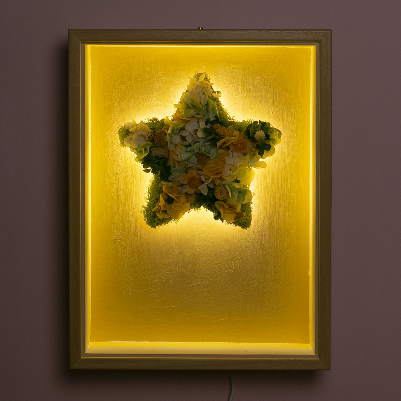 Cuadro iluminado Estrella de flores. Arte en flor natural preservada protegida con vidrio en marco en madera de samba pintado a mano.