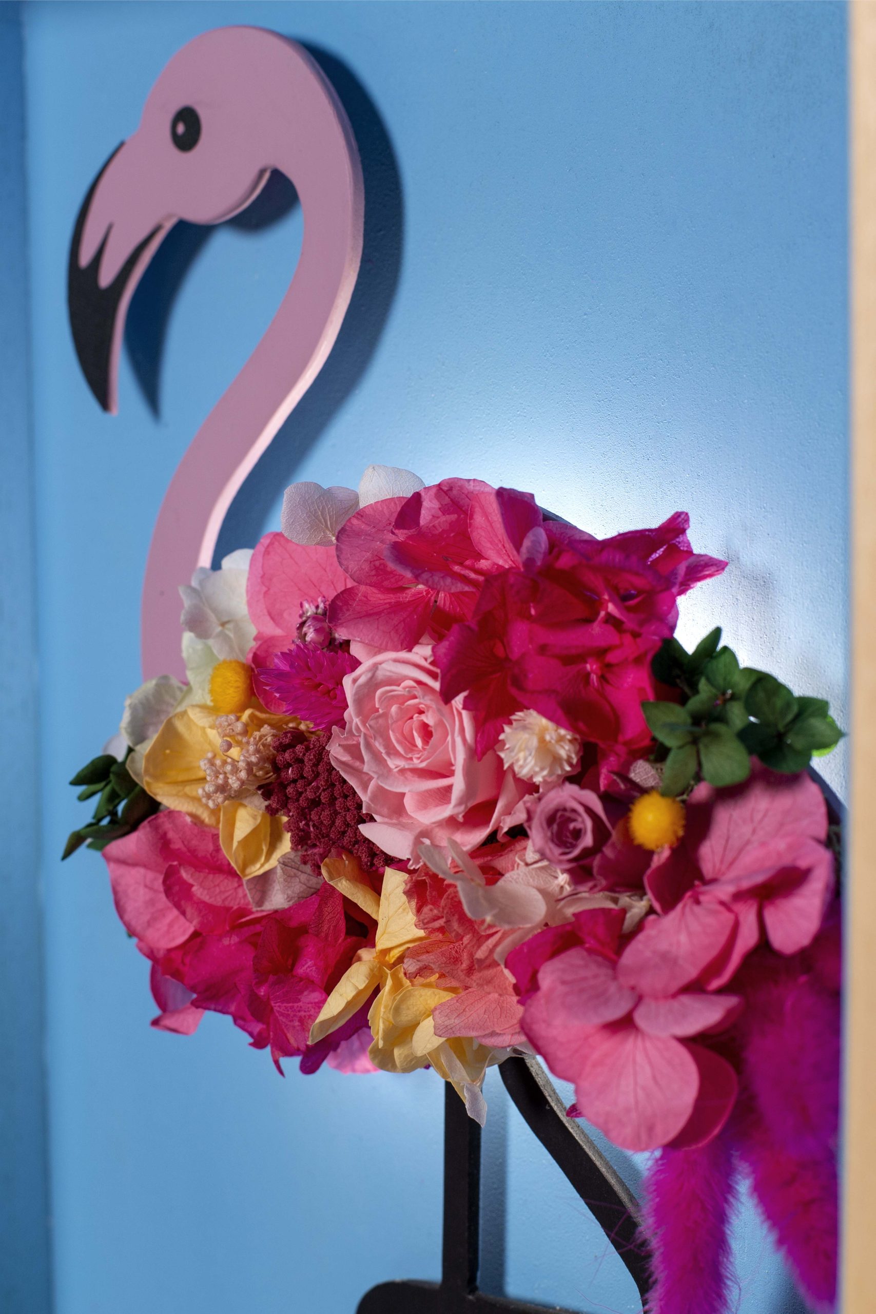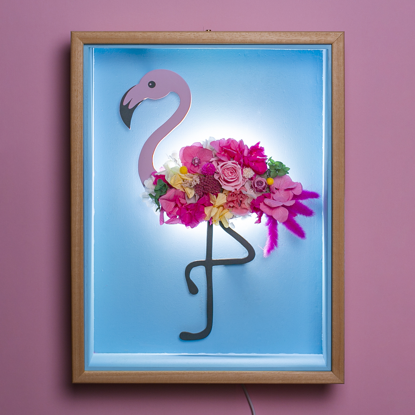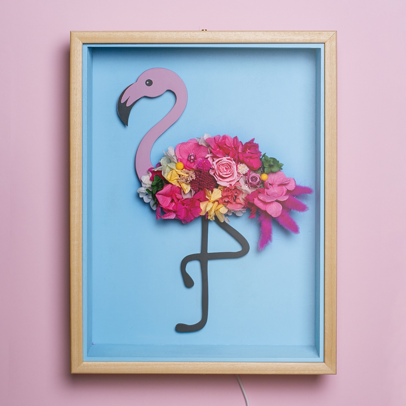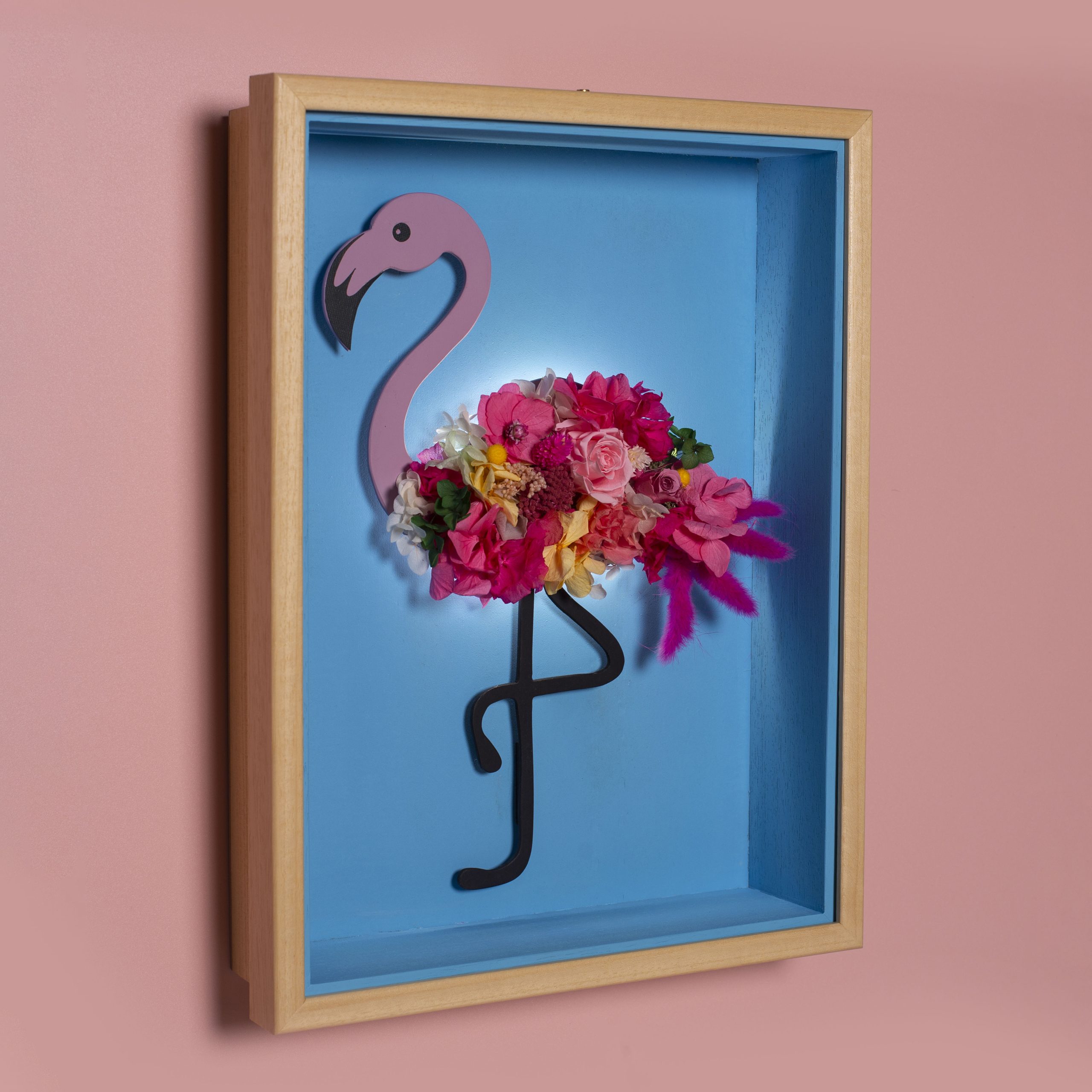 Cuadro iluminado Flamenco de flores. Arte en flor natural preservada protegida con vidrio en marco de madera de samba pintado a mano.