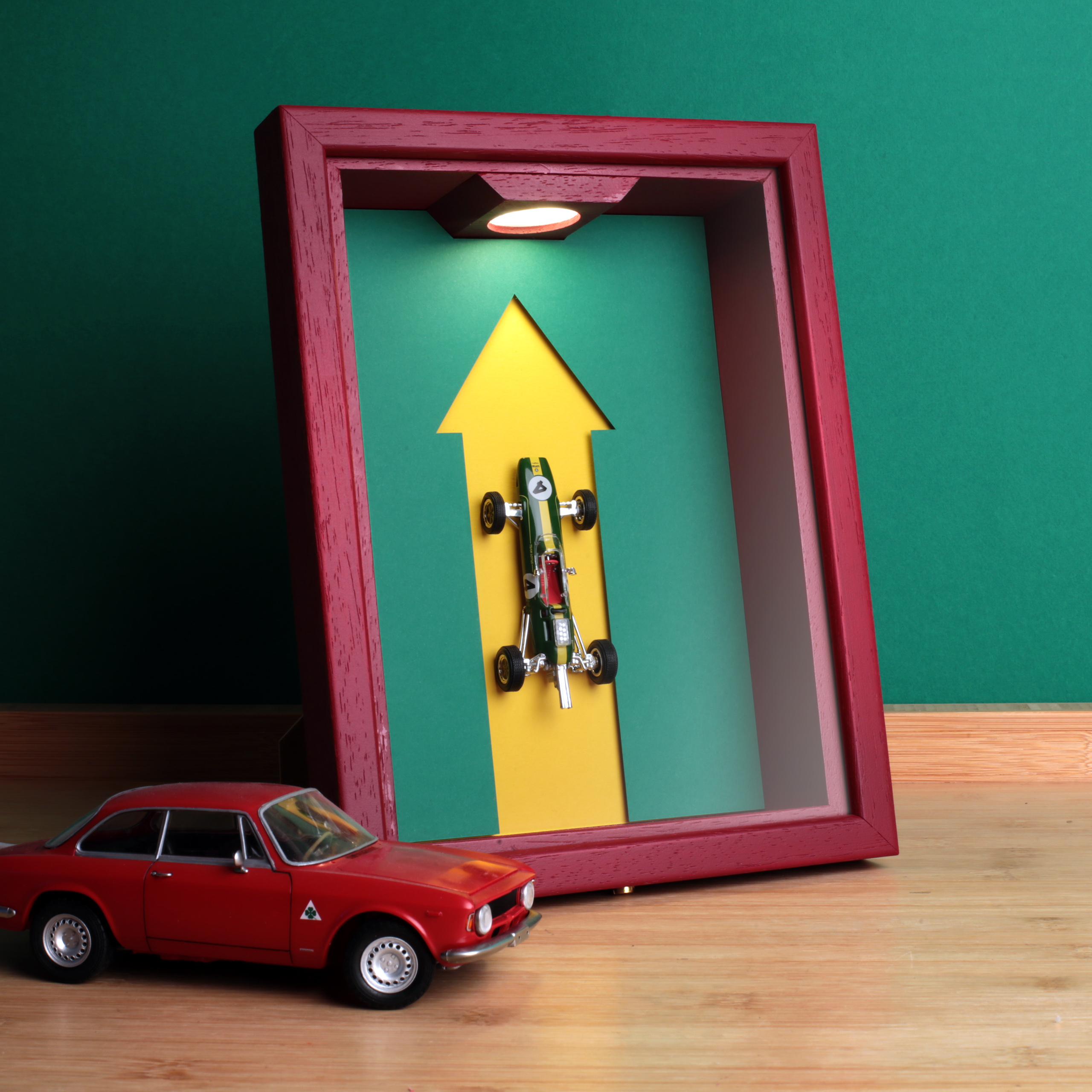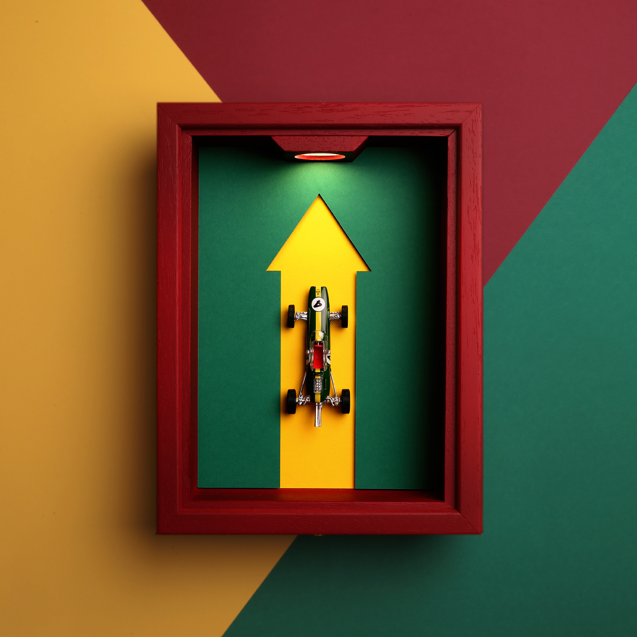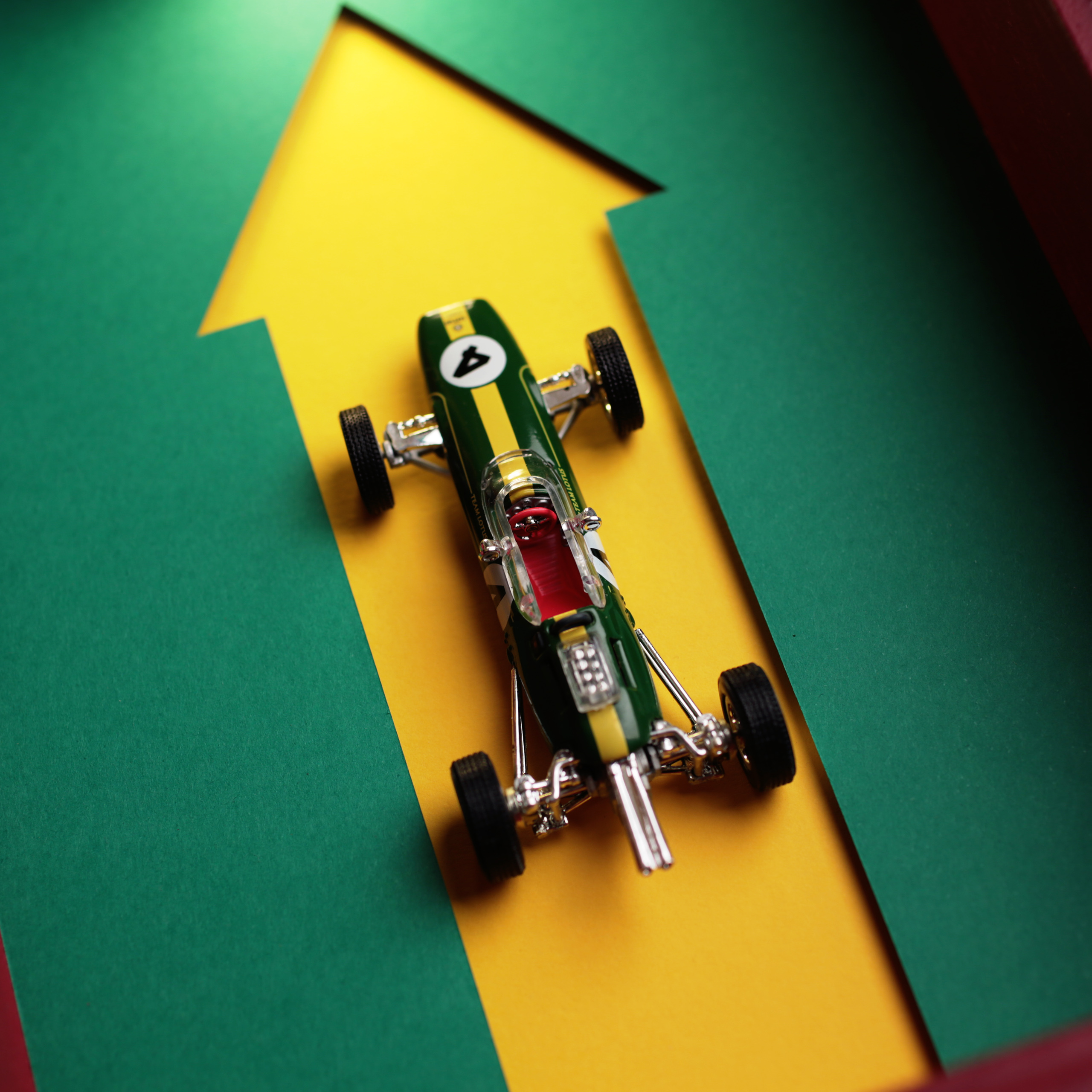 Nuestra versión del Lotus 25 rinde homenaje a los colores elegidos por la escudería: el inevitable British Racing Green perfectamente conjuntado con el atrevido amarillo Lotus.